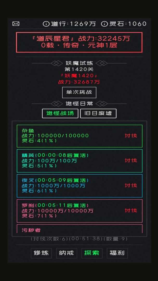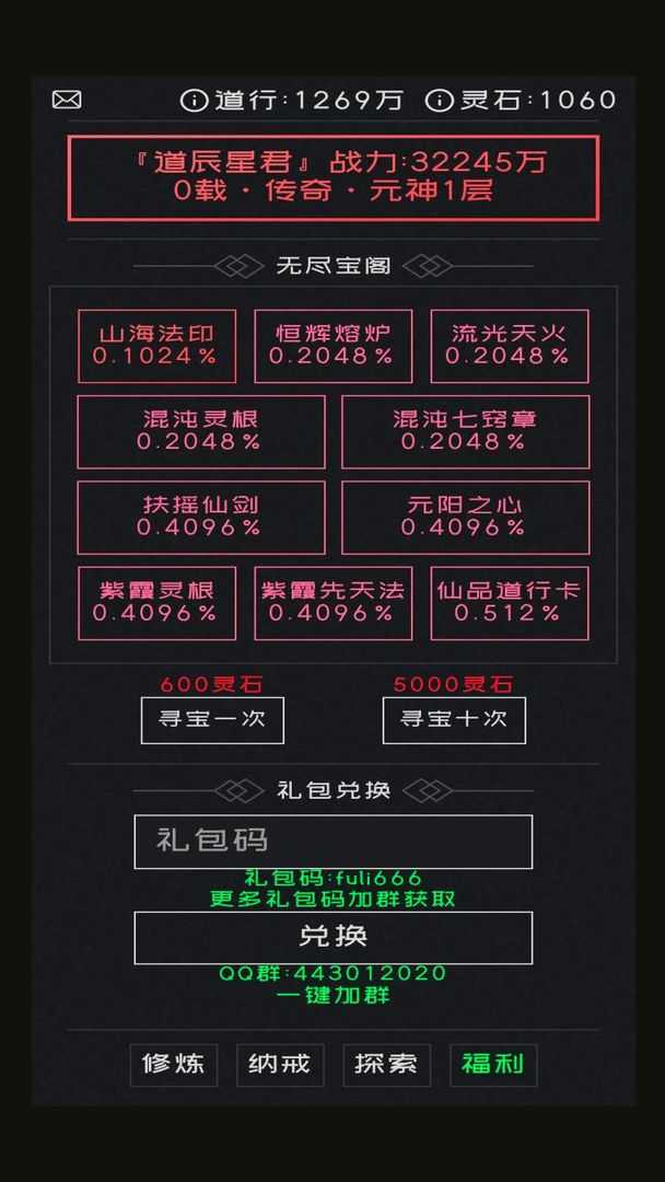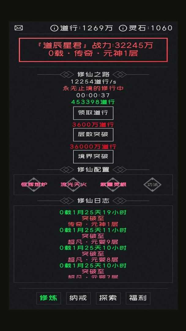 不一样的修仙,练气1层-练气99层,练气无止境,筑基,金丹,元婴,元神,合体,悟道,皆如此。 法宝,神通,灵根,功法,妖魔试炼,诡怪战场,旧日废墟,无尽宝阁,灵石礼包,尽在修仙无止境……