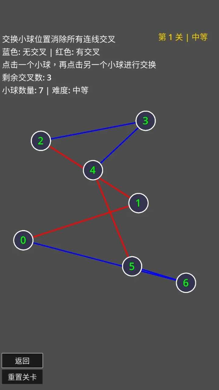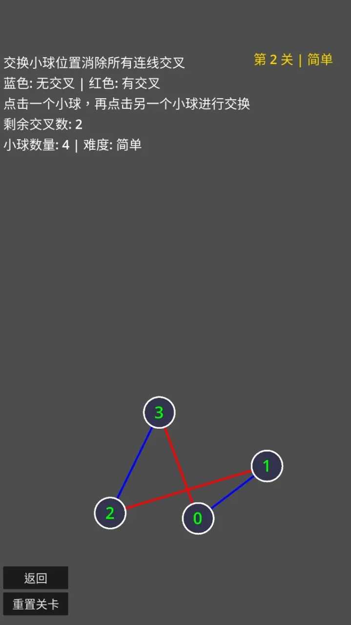 这是一款点击交换小球位置,直到消除所有连线交叉的休闲小游戏。本游戏无广告,无内购,不请求系统权限,无需联网,适合无聊的时候打发时间。
