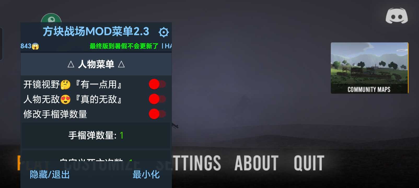 2.3为最终版功能增加至20+可以移步下载2.3版本到暑假不会更新了如有疑问进入游戏查找本人企鹅咨询这里祝大家游玩开心『到暑假会继续更新功能敬请期待』