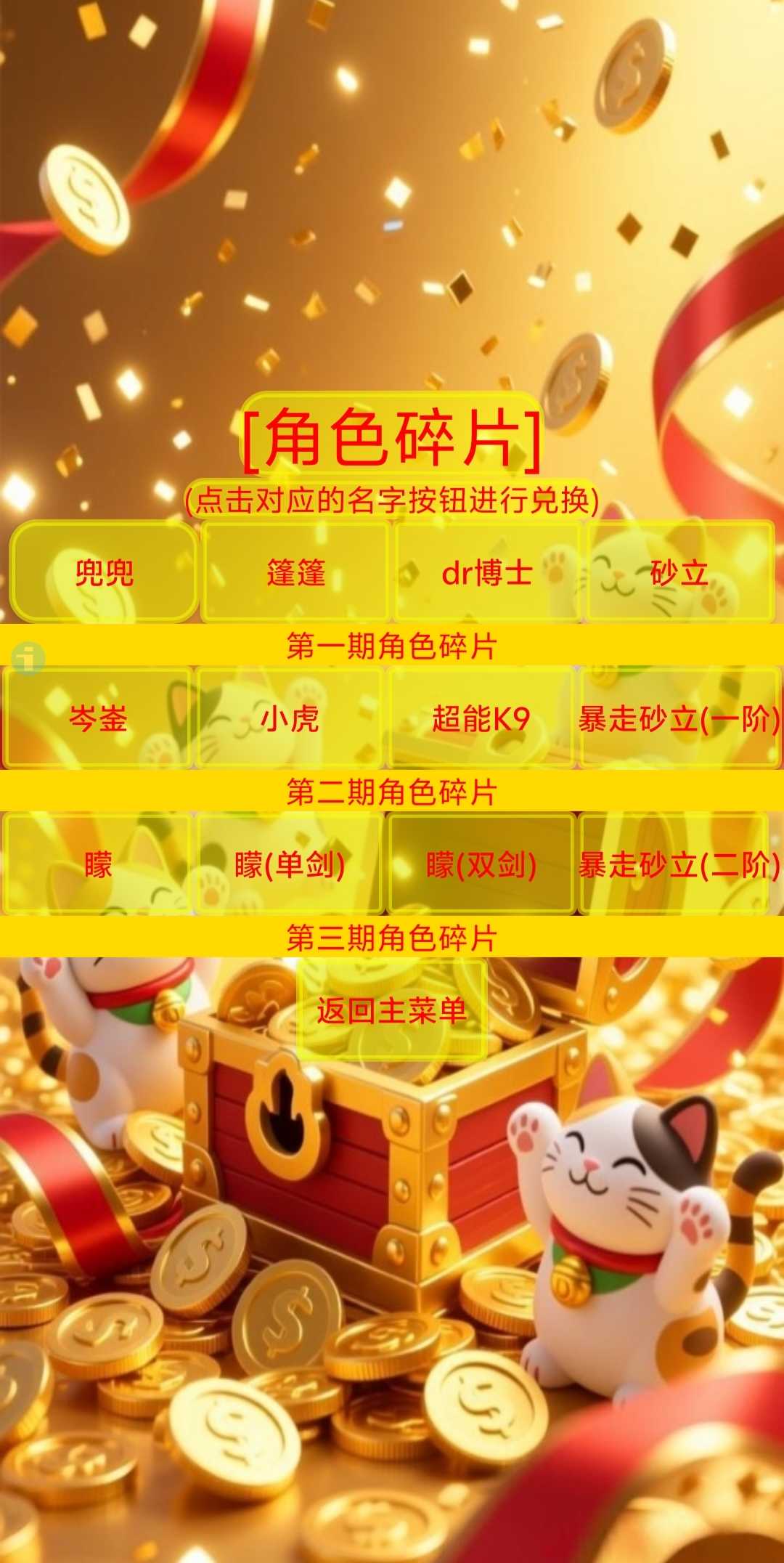 新增第二期的四个角色内容(岑崟,小虎,超能k9,暴走砂立(一阶),获取方式:抽奖碎片兑换