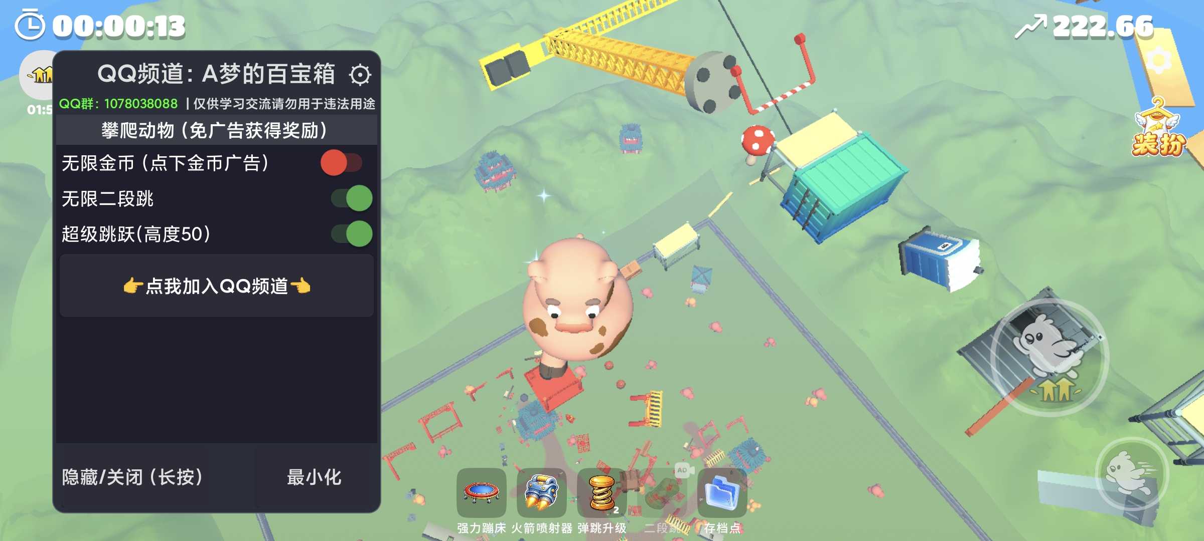 欢迎点击链接加入腾讯频道【A梦的百宝箱】:https://pd.qq.com/s/7b4jdy2uh?b=9 【说明】原创 免广告获得奖励 菜单: 1.无限金币(开启后点击下金币广告) 2.超级跳跃(高度50) 3.无限二段跳(新增,需先使用二段跳道具)